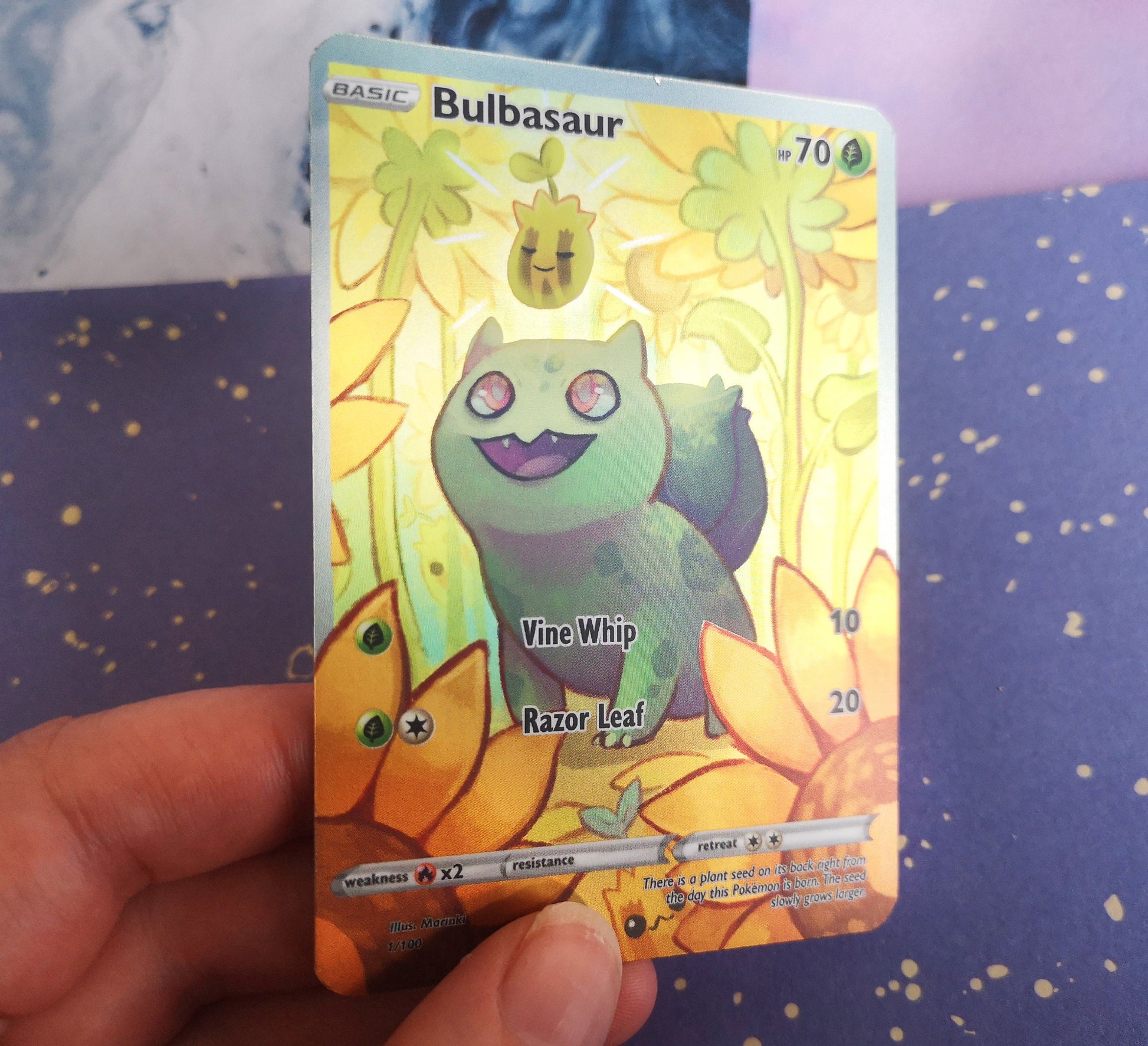 This is a holographic Bulbasaur Pokémon card, designed by me and printed in a factory. The size of the card varies slightly because I cut the cards myself.